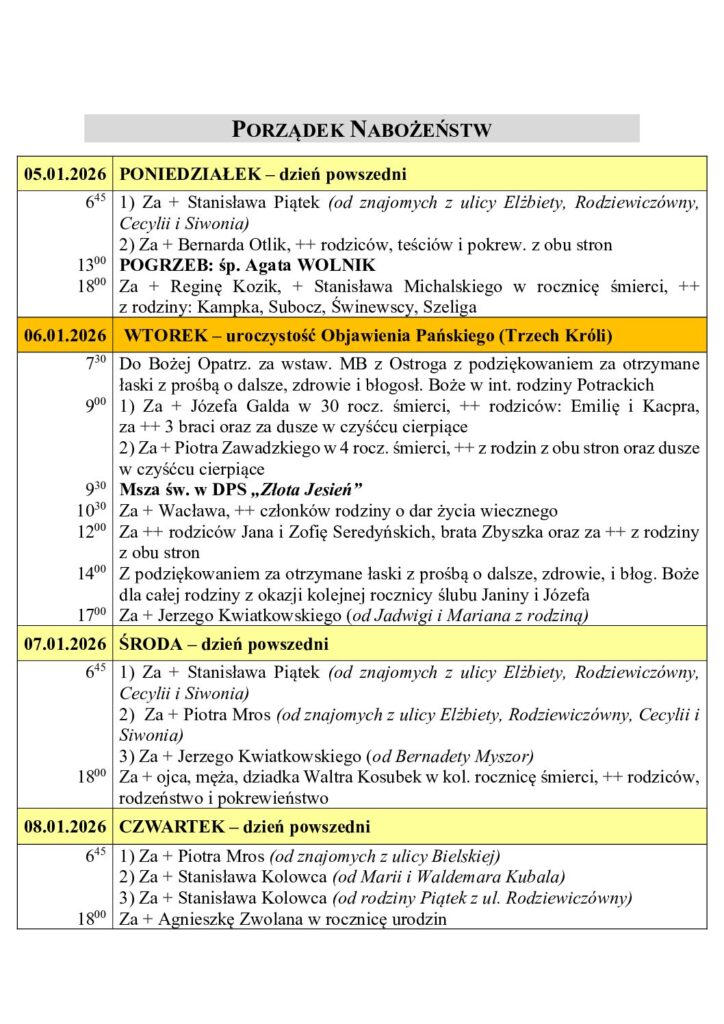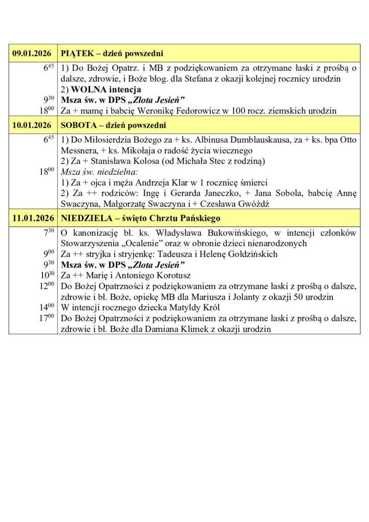Intencje Mszy Świętej 5.01 – 11.01.2026 r.